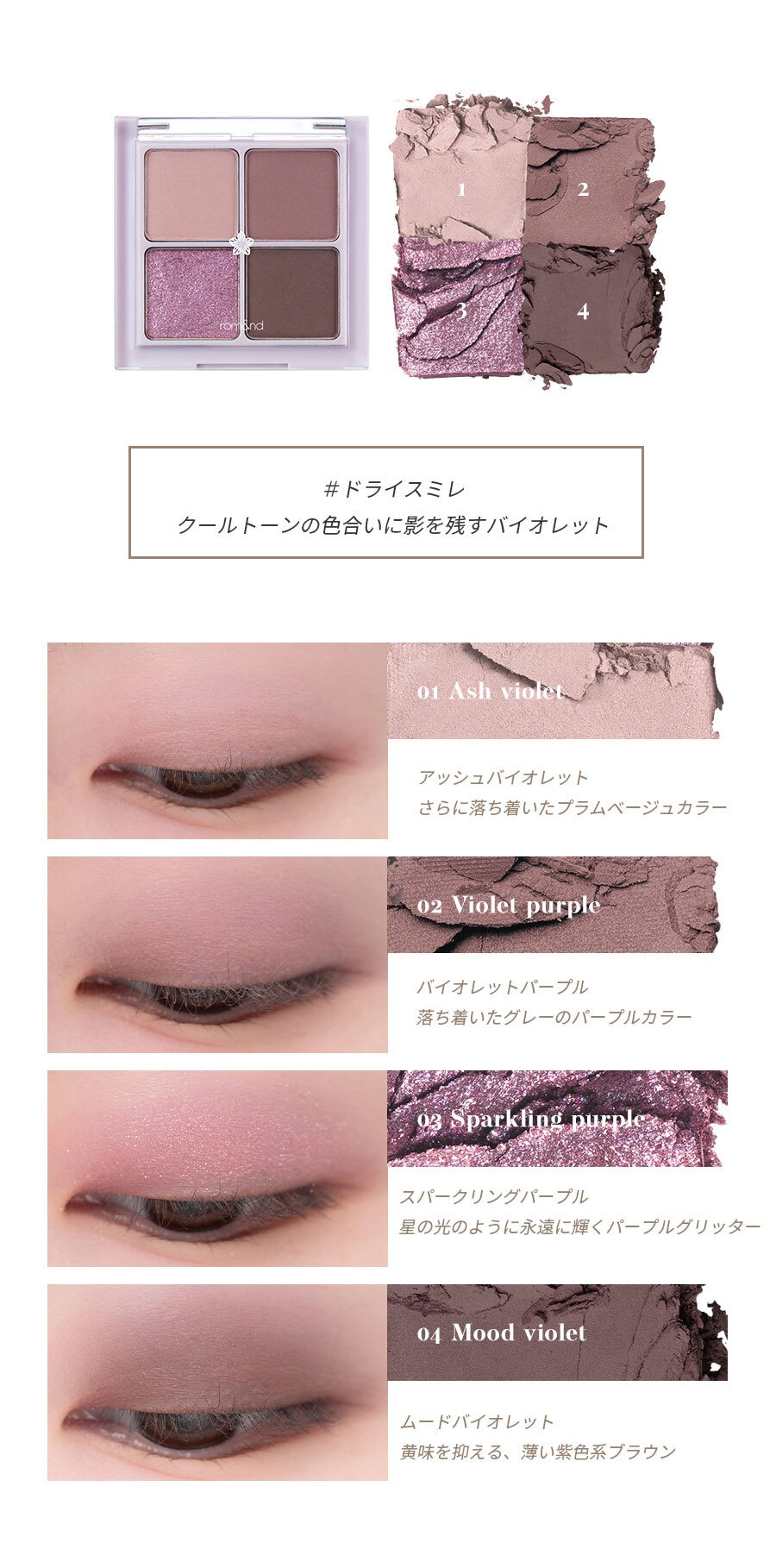 細かい超微細粒子&マット3色・グリッター1色の黄金比率構成で奥深いマット陰影メイクから美しいグリッターメイクまで幅広いアイメイクが楽しめます。