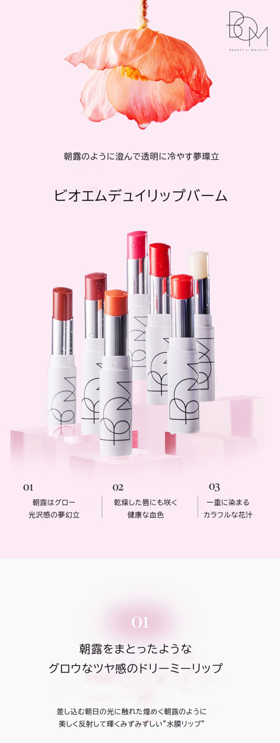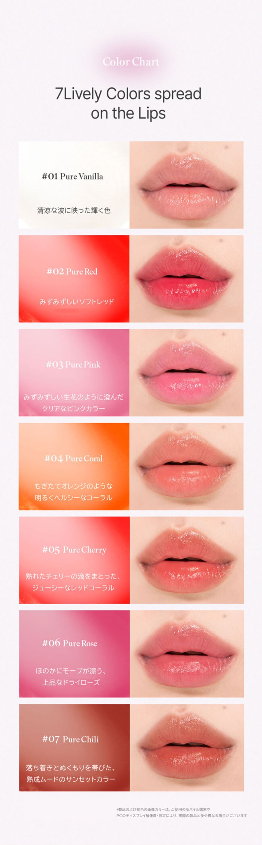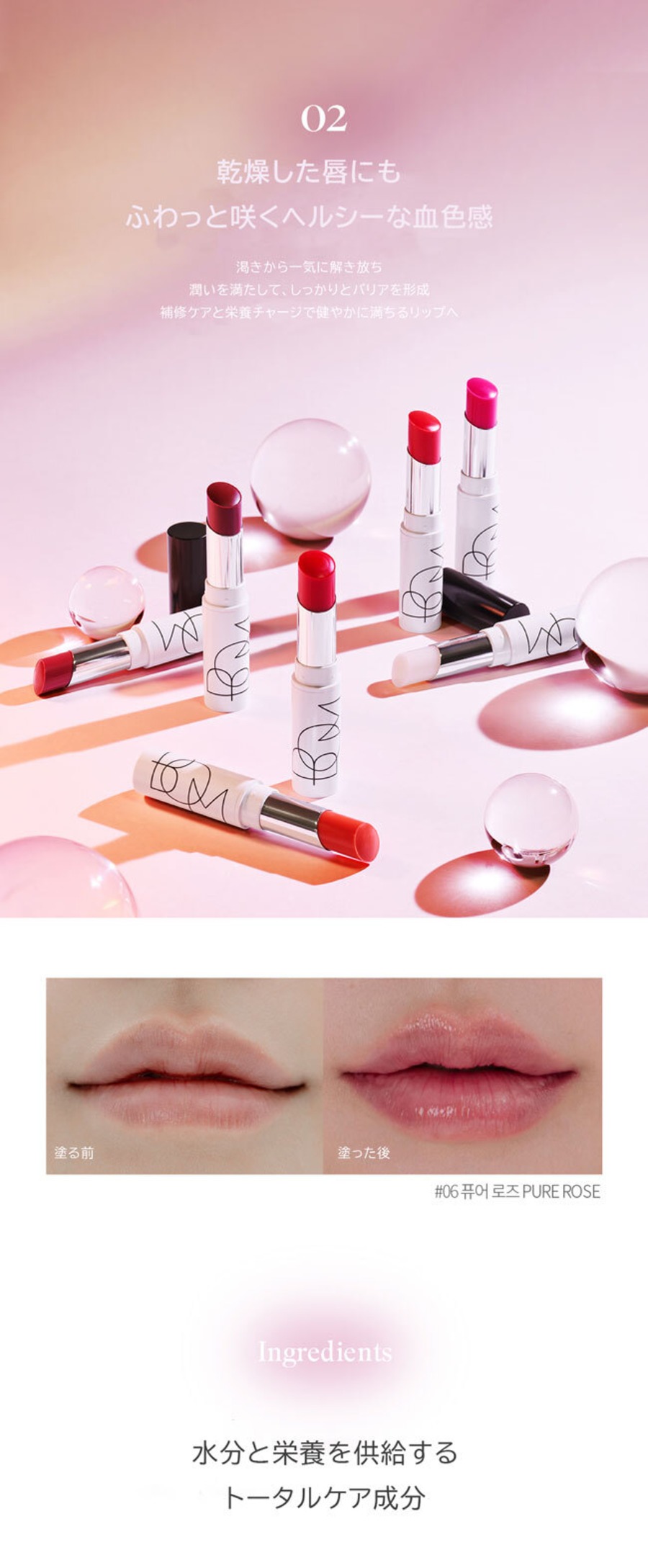 乾燥や角質をケアし、ふっくらなめらかな唇へ。うるうるとしたつややかな水膜クリップ。重ね塗りで濃く、1度塗りで素顔にも使えます