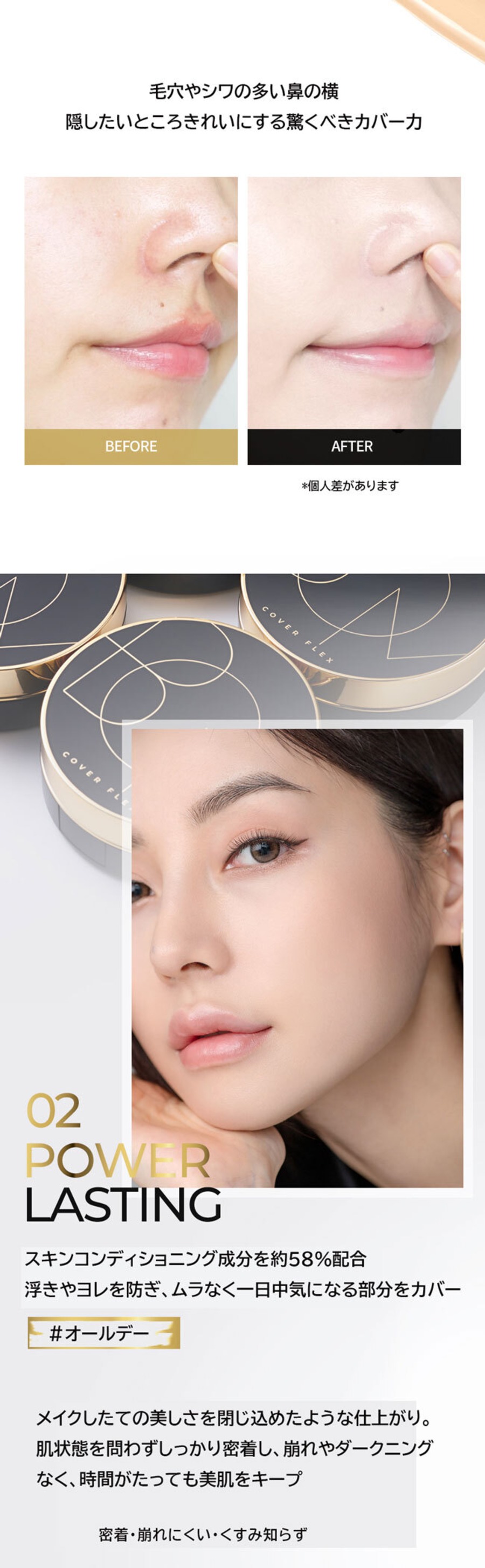 スキンコンディショニング約58%配合、浮きやヨレを防ぎ、ムラなく一日中気になる部分をカバー
