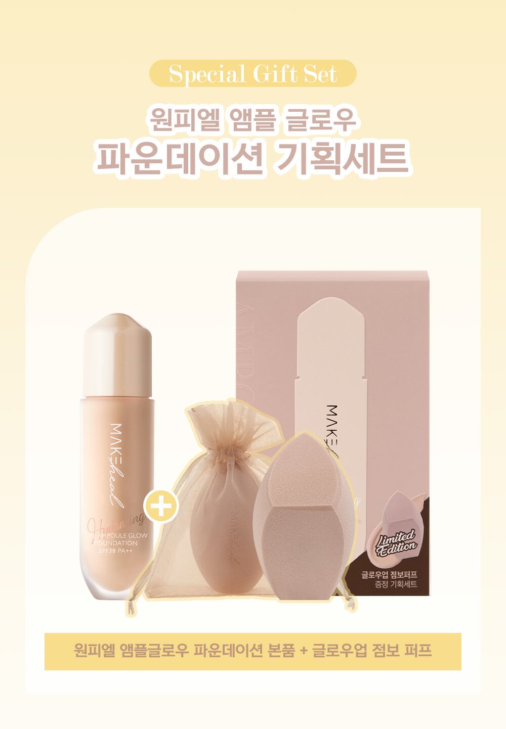 ワンピエールグローファンデーションとスポンジのセット。薄く伸びてつややかな仕上がり、崩れない夏にオススメのファンデ